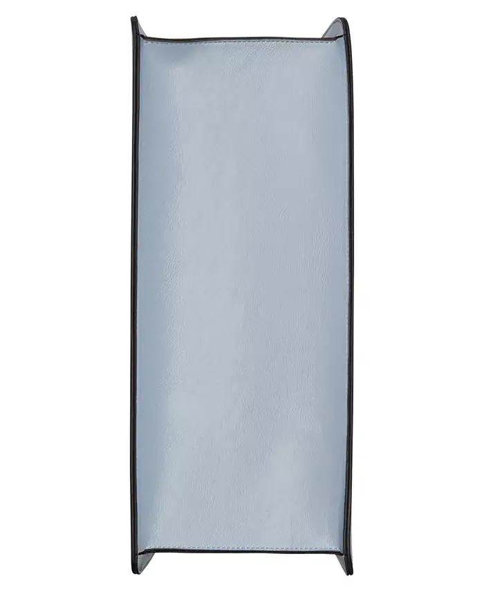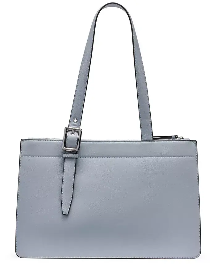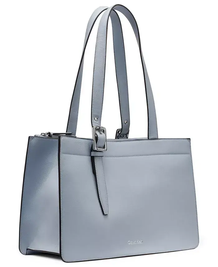 Take on the day with this tote by Calvin Klein. Featuring a structured silhouette, it opens up to a functional interior with plenty of compartments to keep you organized. Medium sized bag; 14-1/2"W x 10"H x 6"D (width is measured across the bottom of handbag); 2.5 lbs. approx. weight Silhouette is based off 5'9" model 11"L handles Magnetic snap closure Hardware tone varies by color & exterior metal logo 4 interior zippered pockets, 4 pen slots, 1 card slot & 1 slip pocket Polyurethane; lining: polyester Spot clean Imported