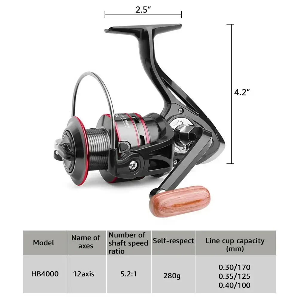 The HB500-HB6000 Heavy Duty Spinning Fishing Reel, which defies the challenging conditions of the seas and oceans, takes your fishing experience to the next level with its powerful performance and durability. Specially designed for offshore fishing in saltwater environments, this reel makes it easy to fight big fish thanks to its robust construction and superior technology. The lightened but reinforced body design offers comfort even during long-term use, while also guaranteeing stability. The advanced casting ring and alloy wire reel protect your line, allowing you to make longer and smoother casts. The HB500-HB6000 is not only powerful, but also offers a smooth user experience. The main drive gear is made of corrosion-resistant and long-lasting zinc alloy. This gear works in perfect harmony with the solid brass pinion gear to deliver ultra-smooth performance. The combination of 12 high-quality ball bearings and a 5.2:1 / 4.7:1 gear ratio allows you to feel the smoothness with every turn. The fishing reel's wire reel is specially designed for easier line release and longer casts. The chrome-plated spool does not damage the line thanks to its high hardness and polished surface. The precise gears in the drive gear provide powerful and stable operation even when fighting big fish. The maximum drag power of 8KG prevents you from having trouble pulling large fish weighing approximately 8 kilograms. Push the limits in your fishing adventures with the HB500-HB6000.