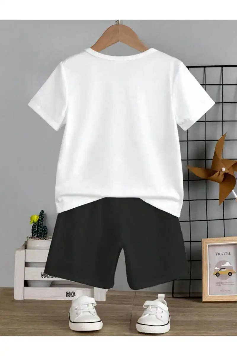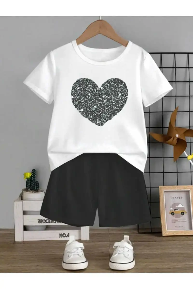 The Heart Cotton Kids Set, made of soft cotton fabric, provides all-day comfort, ensuring your child looks comfortable and stylish during the summer months. The set, consisting of a white bike collar t-shirt and black shorts, is decorated with a cute heart print.