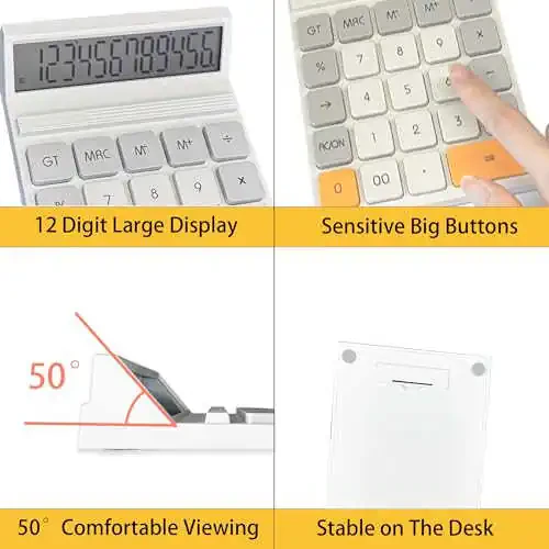 12 ta raqamli katta LCD displey: 12 ta raqamli katta LCD displey 50° moyillik ekran bilan yaratilgan, endi siz o‘tiradigan holatingizni o‘zgartirmasdan ham ekran ustidagi yirik sonlarni aniq ko‘rishingiz mumkin Estetik stol aksessuarlari: bu oddiy kalkulyator turli holatlar uchun yaratilgan, biznes, ofis, uy va boshqalar. U shuningdek video tomoshaqilayotganda yaxshi stol aksessuari hisoblanadigan stend vazifasini o‘taydi Sezgir va yirik tugmalar: stol kalkulyatori ilmiy jihatdan katta tugmali dizaynni qabul qiladi. Katta tugmalar insoniy odatlarga mos keladi va tegizishga qulay Batareya bilan ishlaydigan oddiy kalkulyator: stol ustida barqaror turadi va tez bosish va hisob-kitoblar uchun yordam beradi, elektron stol kalkulyatorida 10 daqiqalik o‘z-o‘zidan o‘chadigan funksiya mavjud, 1 AAA batareya talab qilinadi (qo‘shib berilgan) Funksiyalar: qo‘shish, ayirish, ko‘paytirish, bolish, umumiy yig‘indi, CE, yoqish, AC tugmasi va o‘z-o‘zidan o‘chadi