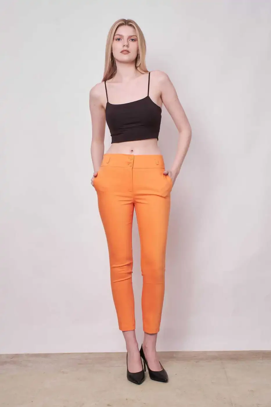 **High Waist Thick Belt Pocket Tapered Ankle Length Cotton Lycra Fabric Pants -mango**
