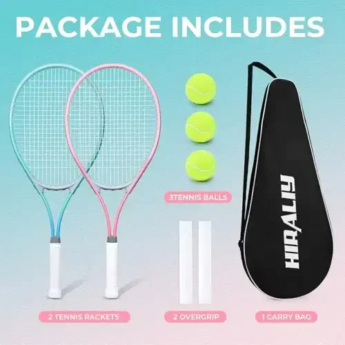 HIRALIY 27" Tennis Rackets Set is a comprehensive tennis starter set designed for adults. This set is ideal for anyone new to tennis or looking to enjoy playing tennis. It includes two pre-strung tennis rackets, two overgrip tapes, three tennis balls, and a bag for easy carrying. This set is an excellent choice for outdoor recreational sports activities and is suitable for both men and women. The lightweight design of the rackets minimizes fatigue even during long training sessions, allowing you to enjoy the game. Beginners, in particular, can easily develop their interest and confidence in tennis with these lightweight rackets. The HIRALIY tennis racket set stands out with both its high-quality materials and its useful design.