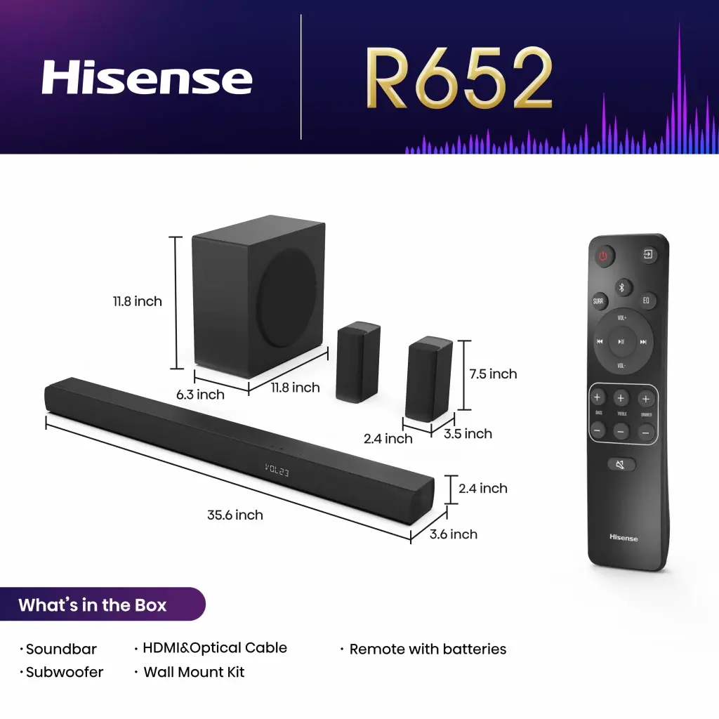 Hisense 5.1 Ch Soundbar R652 jami 440W chiqish quvvatiga ega, orqa o'rab turuvchi karnaylar, 6.5 dyuymli simsiz subwoofer, Dolby Atmos va DTS Virtual X, oson ulanish
