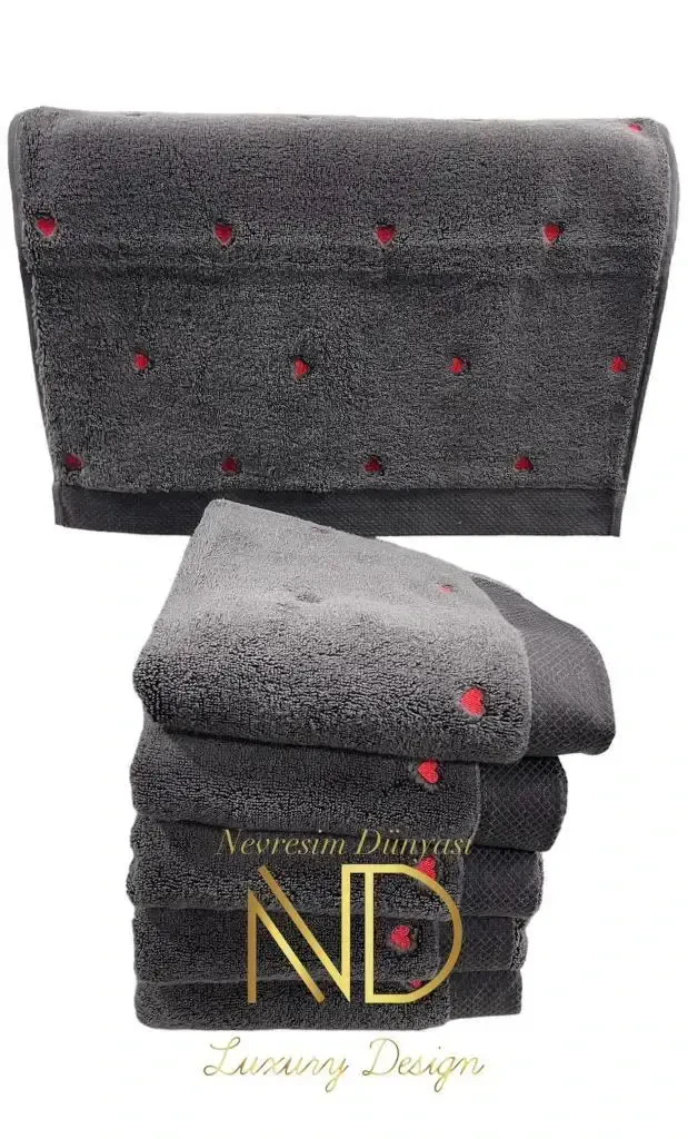 Bring elegance and comfort to your bathroom with the Hobby Lubow Love Dark Grey Red Embroidered 6-Piece Towel Set. This specially designed towel set will enrich your bathroom experience with its high-quality cotton texture and elegant embroidery details. The vibrant red embroidery on a dark grey background adds a modern and eye-catching touch to the towels, while also adding a sophisticated touch to your bathroom's decor. The 6 towels included in the set are ideal for daily use and provide a stylish presentation when hosting guests. Made from 100% cotton, these towels gently touch your skin thanks to their soft texture and help you dry quickly with their high absorbency. The durable structure of the towels offers long-lasting use, while maintaining the vibrancy of their colors and making them look like new after every wash. The Hobby Lubow Love towel set is a perfect choice for yourself and your loved ones. This towel set will be a part of not only your bathroom but also your life. Drying off with these soft towels after your morning shower or after washing your hands will allow you to start the day refreshed and pleasantly. In addition, thanks to its stylish design, it creates a pleasant ambiance in your bathroom and impresses your guests. Combine luxury and comfort in your bathroom with the Hobby Lubow Love Dark Grey Red Embroidered 6-Piece Towel Set.