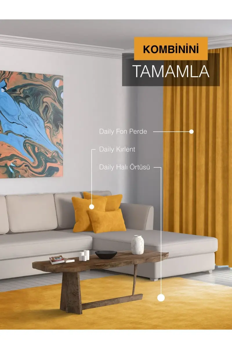 Product Features: Brand: Home Daily Series, Model: Ada Curtain, Color: Saffron, Size: 140x270 cm, Material: 100% Polyester, Light Transmission Rate: 60-70%, Care: Washable at 30°C, Ironing: Ironable at low temperature.Product DescriptionAdd a warm and inviting touch to your home with the Home Daily Series Saffron Color Ada Curtain. This elegant curtain brings energy and style to your room with the vibrancy of saffron color, while easily adapting to all kinds of decorations with its modern design. The Ada Curtain not only offers an aesthetic look, but also makes your living spaces more comfortable with its functional features. Made of high quality 100% polyester fabric, this curtain offers long-lasting use and easy care. The texture of its fabric softens the light, spreading a pleasant ambience to your room and creating a relaxing atmosphere at any time of the day. Thanks to its standard size of 140x270 cm, the Ada Curtain, which is suitable for many window types, can be easily installed and is ready for use. Whether you use it in your living room, bedroom or study, this curtain will instantly change the atmosphere of your room. When the warmth of saffron color and the elegance of modern design come together, a unique aesthetic emerges. The Ada Curtain, produced with Home Daily Series quality, will be an indispensable part of your home decoration. Thanks to its 60-70% light transmission feature, it filters the light from outside without darkening your room completely and provides ideal lighting throughout the day. This feature offers a great advantage especially for those who are disturbed by sunlight in the morning or who want to relax during the day. In addition, the fabric of the curtain is easily cleanable and washable. You can preserve the curtain's original vibrancy by washing it in the machine at 30°C or by hand. Thanks to the low-temperature ironing feature, you can easily straighten your curtain and always achieve a stylish look. Home Daily Series Saffron Color Ada Curtain is a product that adds visual richness and offers practical use. It is an ideal choice to complete the decoration of your home and make your living spaces more comfortable. Add warmth, style and functionality to your home with this curtain.Product Features* Brand: Home Daily Series* Model: Ada Curtain* Color: Saffron* Size: 140x270 cm* Material: 100% Polyester* Light Transmission Rate: 60-70%* Care: Washable at 30°C* Ironing: Ironable at low temperatureAdditional InformationOur product has OEKO-TEX® Standard 100 certificate, which means that it does not contain any substances harmful to human health. You can use it safely. The curtain is sent with the curtain rail attachment. Thanks to its easy installation, you can start using it in a short time. The color tone of the product may vary slightly depending on your screen settings.
