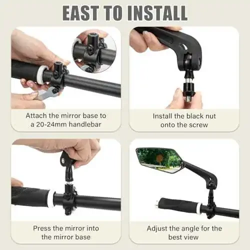 HOMEE velosiped ko'zgulari xavfsiz va yoqimli velosipedda yurish tajribalari uchun mo'ljallangan. 360° sozlanadigan aylanadigan mexanizmi bilan, ko'zgularni istalgan burchakka aylantira olasiz va atrofingizni aniq ko'ra olasiz. HD shishadan yasalgan ko'zgular buzilishsiz va aniq ko'rinishni ta'minlaydi. Velosiped, motosikl va elektr velosiped rullariga osongina o'rnatish mumkin bo'lgan mustahkam va bardoshli dizaynga ega.