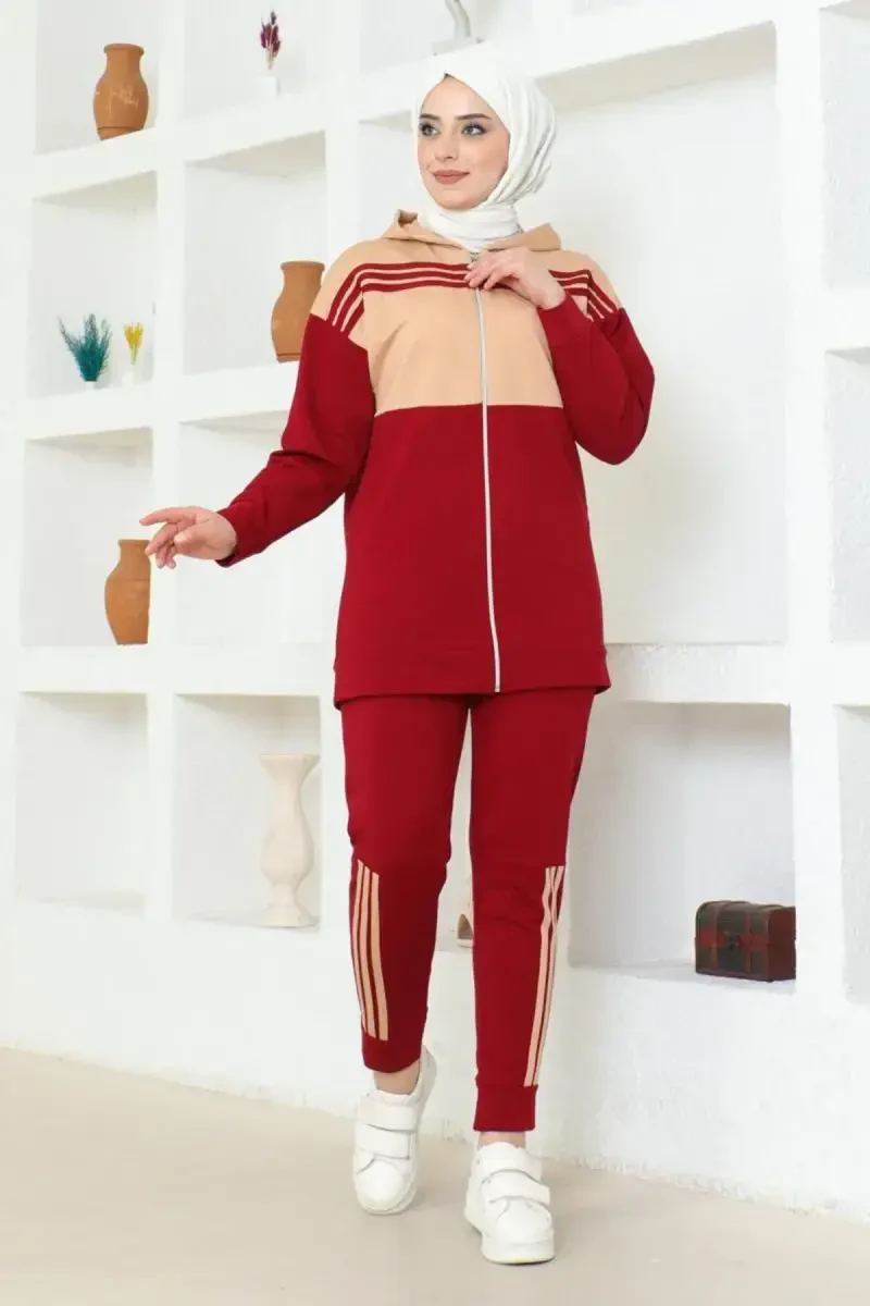 Tracksuits are an ideal choice for everyday wear. They are a perfect option for those seeking both comfort and style, whether during workouts or everyday life. The hooded top offers practicality with its zippered pockets, while the sweatpants provide comfort all day long with their relaxed fit. The combination of burgundy and latte colors elevates the set's elegance.