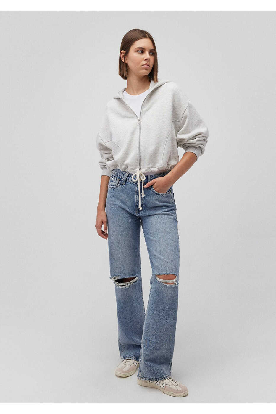 Combining style and comfort, the Hooded Zip-Up Beige Crop Sweatshirt will become an indispensable part of your wardrobe. Perfect for everyday wear, this sweatshirt will envelop you in its soft and comfortable texture.