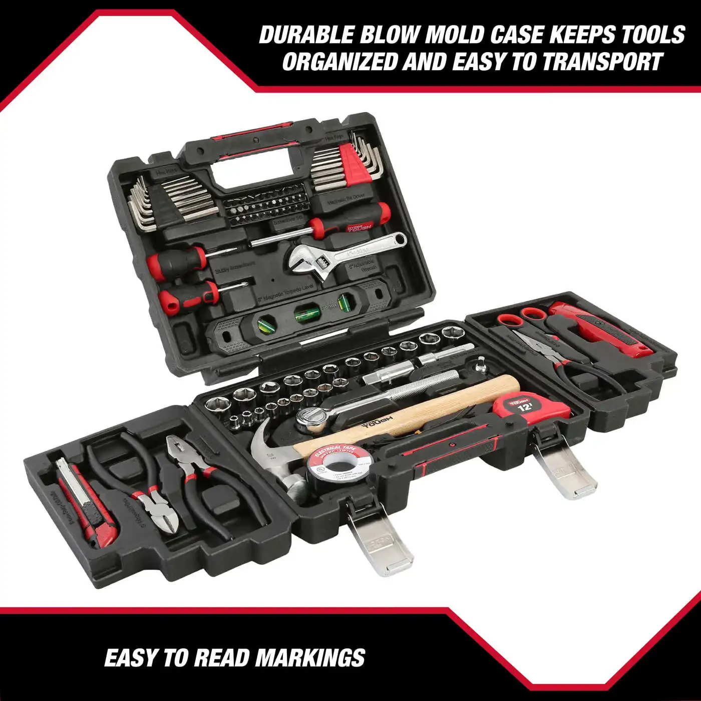 Be prepared for all your home repair and DIY projects with the Hyper Tough 118 Piece Home Repair Tool Set (Model 7003)! This comprehensive tool set is the perfect solution for homeowners, renters, and hobbyists. Whether you need to make a small repair or start a large project, this set has everything you need. The set includes the most frequently needed essential tools: a sturdy 8 oz. hammer, a 6-inch adjustable wrench ideal for tightening and loosening screws, 3 types of pliers with different functions, a 9-inch level for smooth and precise measurements, a 3/8-inch ratchet handle and various sizes of sockets for easy removal and installation of nuts and bolts, both SAE (Inch) and metric hex wrenches, and more! This rich content helps you with different types of repair and assembly work. The Hyper Tough 118 Piece Tool Set not only offers a wide variety of tools, but also provides a neat and portable storage solution. The durable and handy tool bag keeps all your tools safe and easily accessible. This way, you can quickly find the tool you need and focus on your work. The tool bag can be easily stored in any corner of the house, apartment, garage or even in your car. It can be ready for emergency repairs or to start that project you've had in mind for a long time. The Hyper Tough 118 Piece Home Repair Tool Set is not just a tool set, it is also an investment. Made of high-quality materials, these tools will provide reliable service for many years. Whether you are an experienced craftsman or a beginner, this set will help you successfully complete all your home repair and DIY projects. Make your work easier and let your creativity speak with Hyper Tough quality. Remember, every project is an opportunity and with Hyper Tough you can make the most of these opportunities.