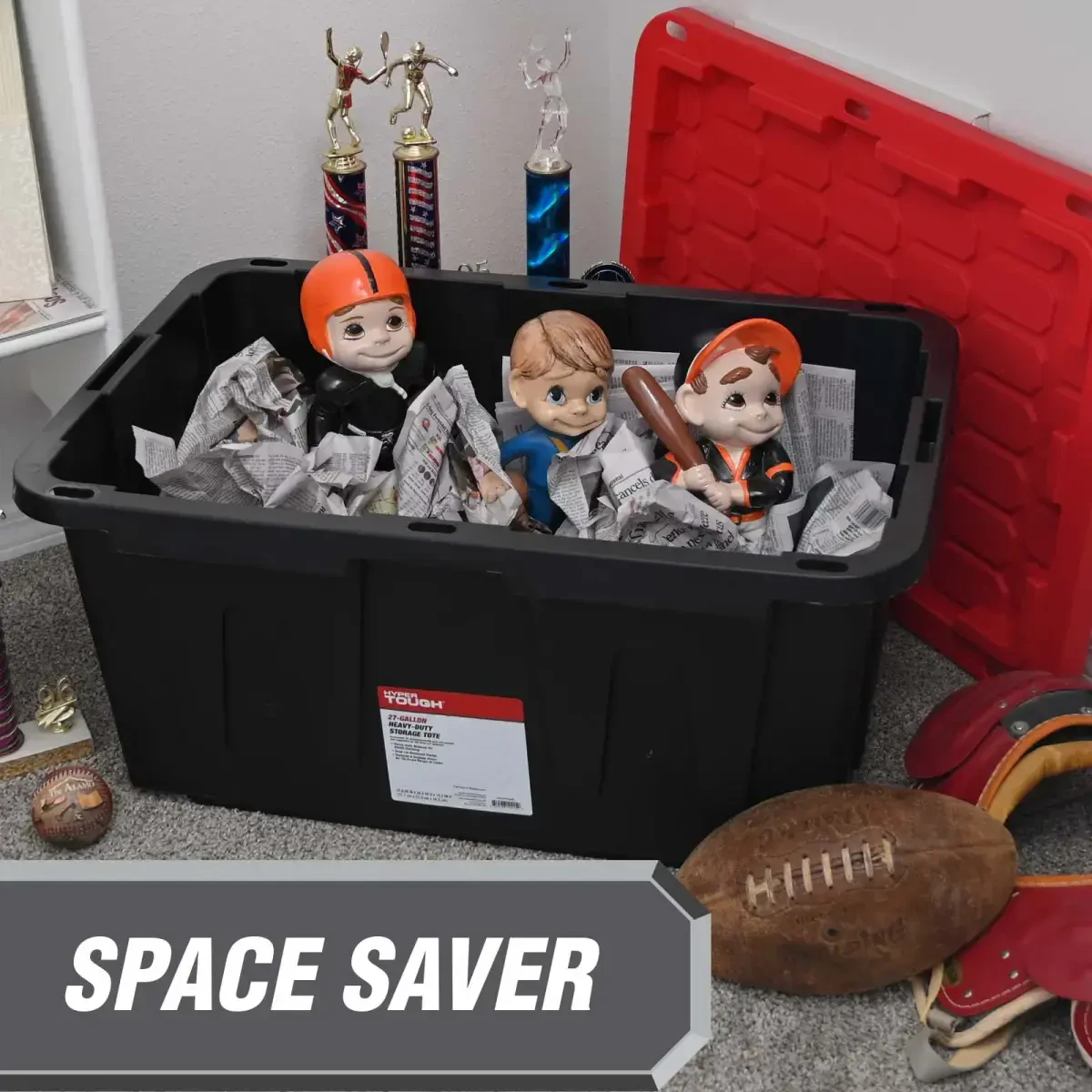Hyper Tough 27 Gallon Stackable Snap Lid Plastic Storage Bins are the perfect solution for keeping everything organized and tidy in your home, garage, or workshop. These durable bins are ideal for storing a variety of items, tools, clothes, and more. The bins' sturdy construction allows them to safely hold heavy items. The snap lid design provides a secure seal and dust-proof protection, keeping your belongings clean and organized.
