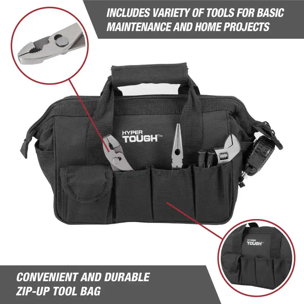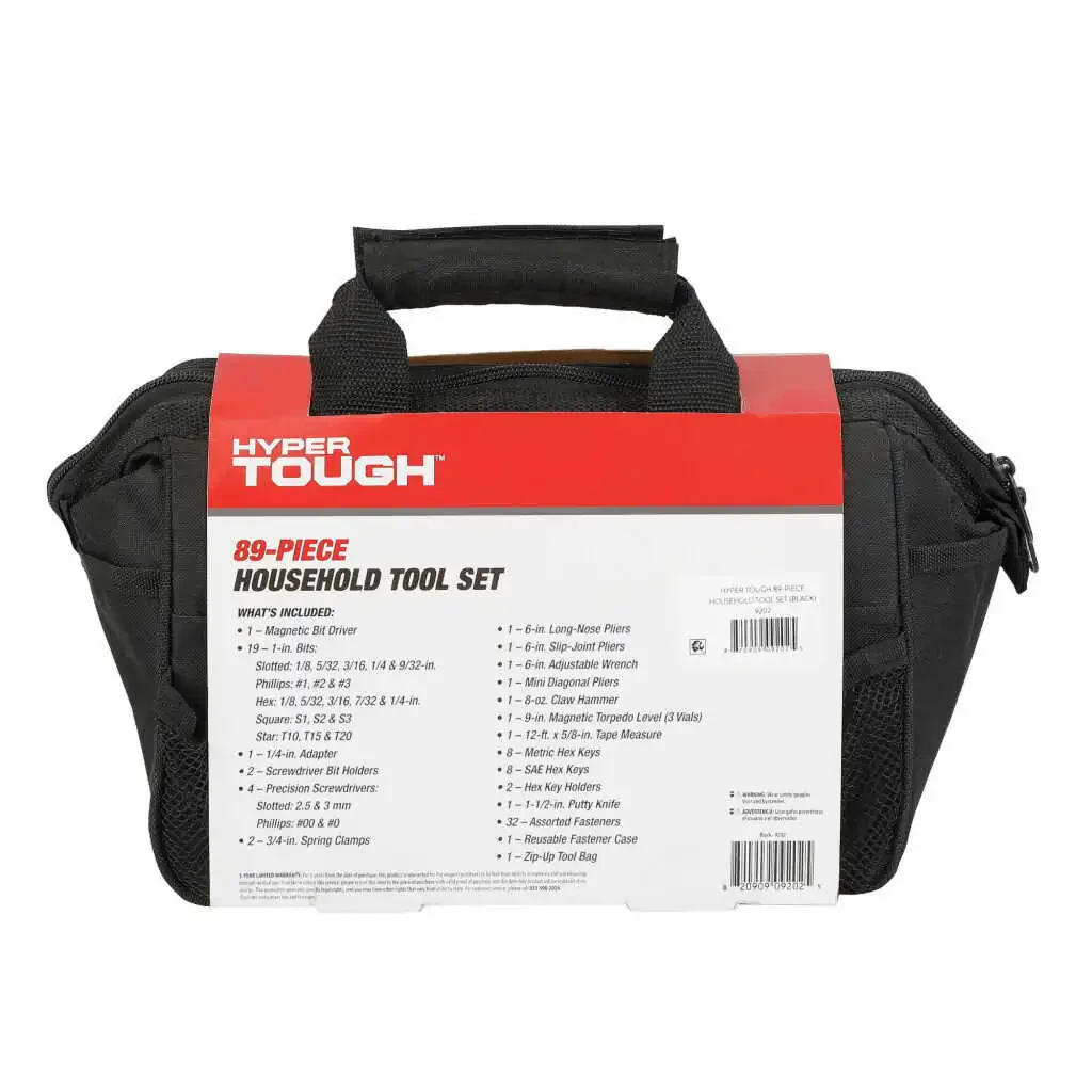The Hyper Tough 89 Piece Black Home Tool Set (model 9202) is a comprehensive solution for all your home repair and renovation needs. This set is suitable for both amateurs and professionals, offering long-lasting and reliable use. It comes with a durable tool bag for orderly storage and easy portability of the tools. The set's contents consist of the tools most needed in daily use.