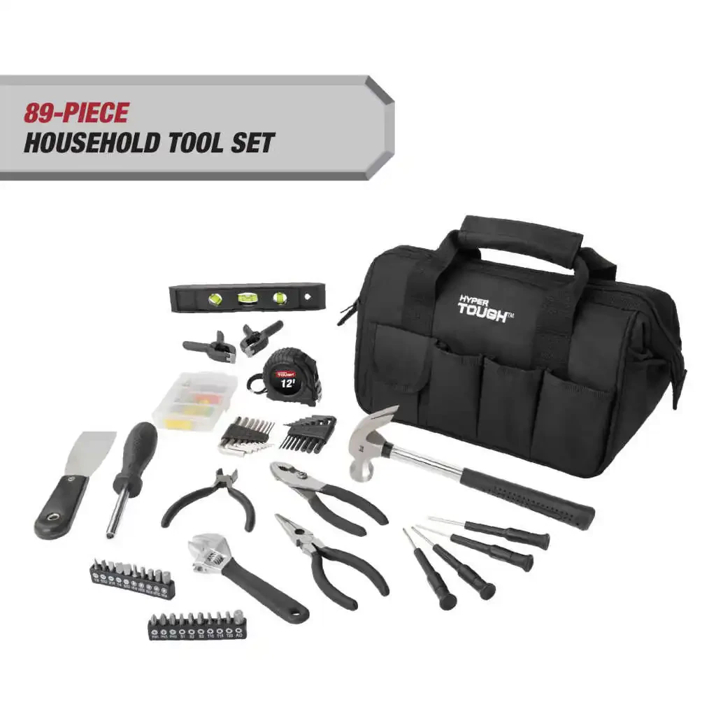 The Hyper Tough 89 Piece Black Home Tool Set (model 9202) is a comprehensive solution for all your home repair and renovation needs. This set is suitable for both amateurs and professionals, offering long-lasting and reliable use. It comes with a durable tool bag for orderly storage and easy portability of the tools. The set's contents consist of the tools most needed in daily use.