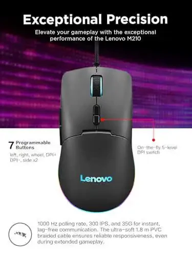 Игровая мышь Lenovo M210 RGB с проводным подключением - 8000 точек на дюйм, 7 программируемых кнопок, 3-зонная RGB-подсветка