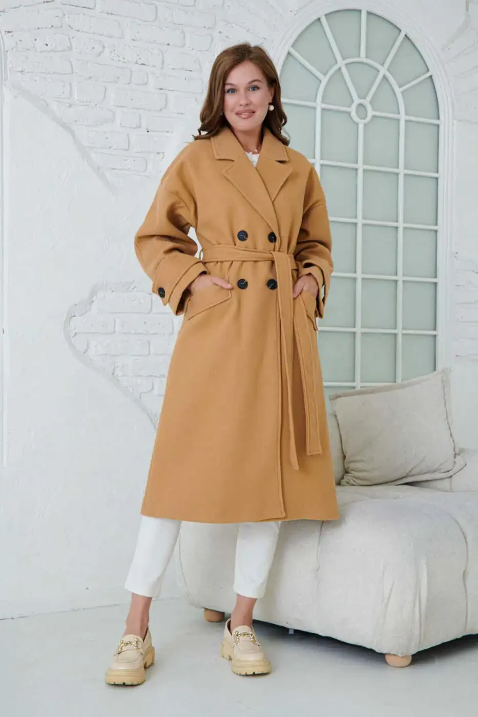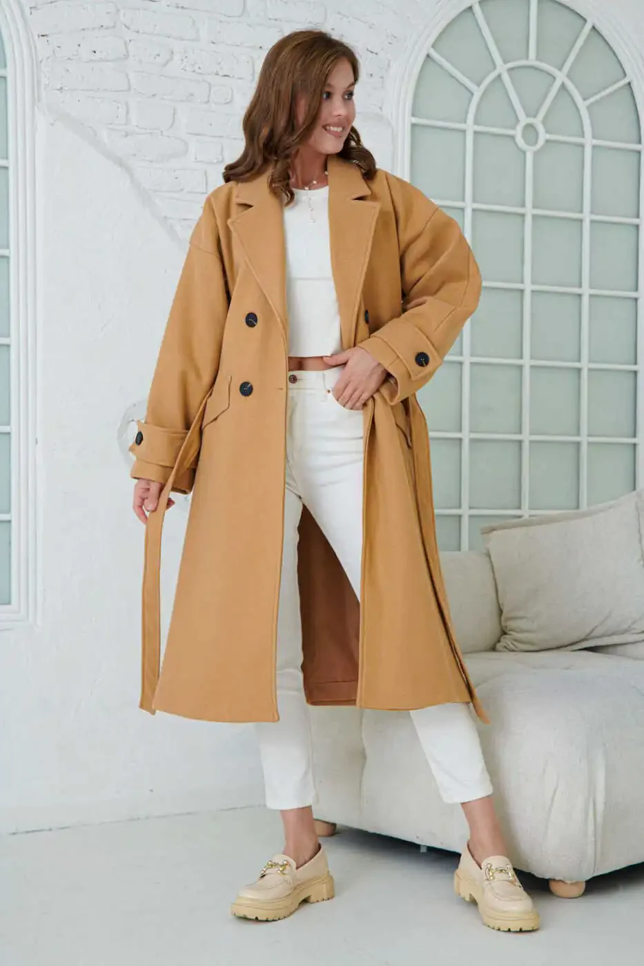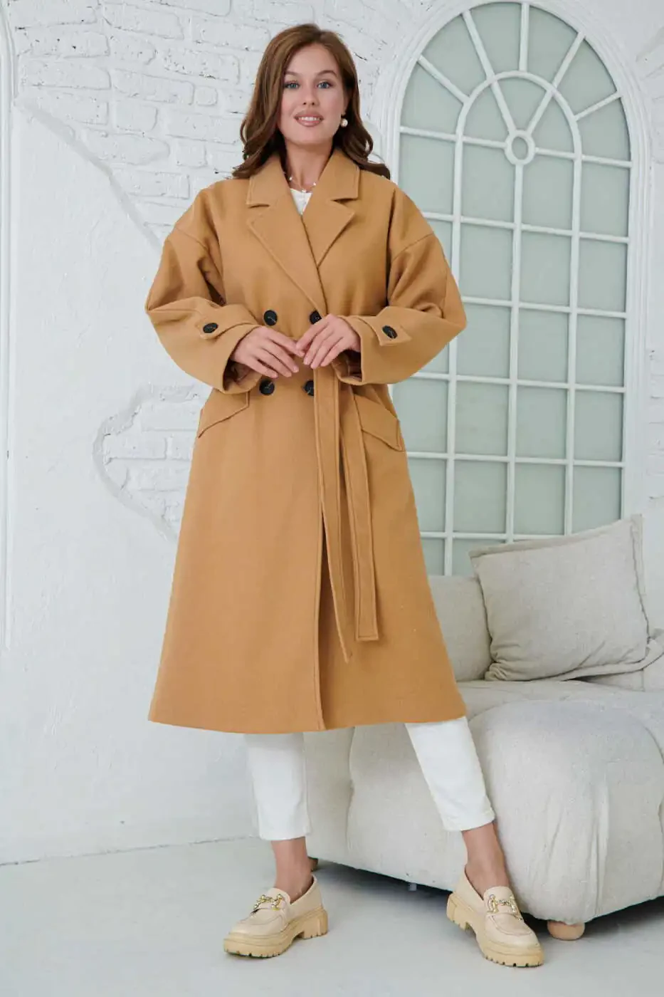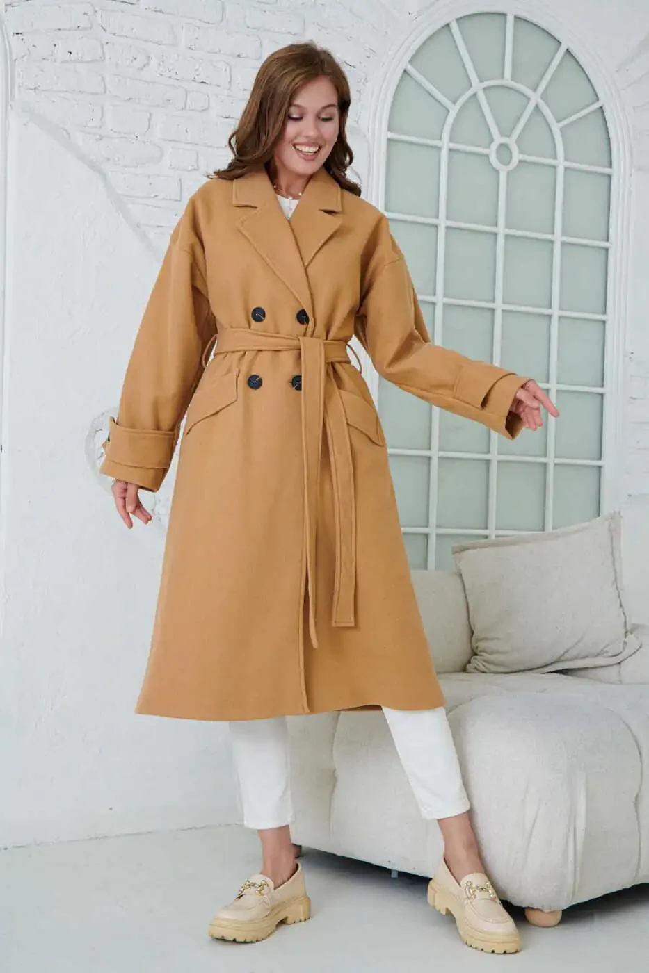 Ayollar uchun ikki tomonlama yoqa tugmali, kamarli, uzun yengli, past yelkali, astarli, midi uzunlikdagi tuya rangi palto 9001 - bu stil va qulaylikni izlovchi ayollar uchun mukammal tanlov.