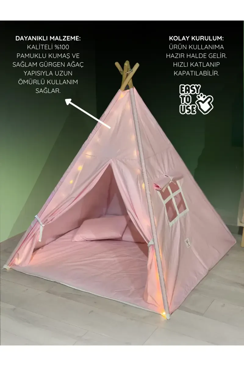 Lighted Children's Play Tent Teepee Play House with Cushion and Pillow Pink-Pink to add color to your children's imagination! This cute and fun play tent allows your children to create their own special spaces, play games and develop their imaginations. This playhouse with a teepee design is a gateway to children's adventurous worlds. This tent, which will conquer the hearts of girls with its pink color and cute design, will also add a nice touch to their rooms. Made of high-quality materials, this play tent can be used safely for many years with its durable structure. The tent's fabric does not contain any substances that could harm children's health and is easy to clean. While the cushion and pillows increase children's comfort, the lights on it add a warm atmosphere to the environment and increase the enjoyment of the game. This play tent also helps children socialize and play games with their friends. The large interior volume of the tent allows more than one child to play comfortably at the same time.