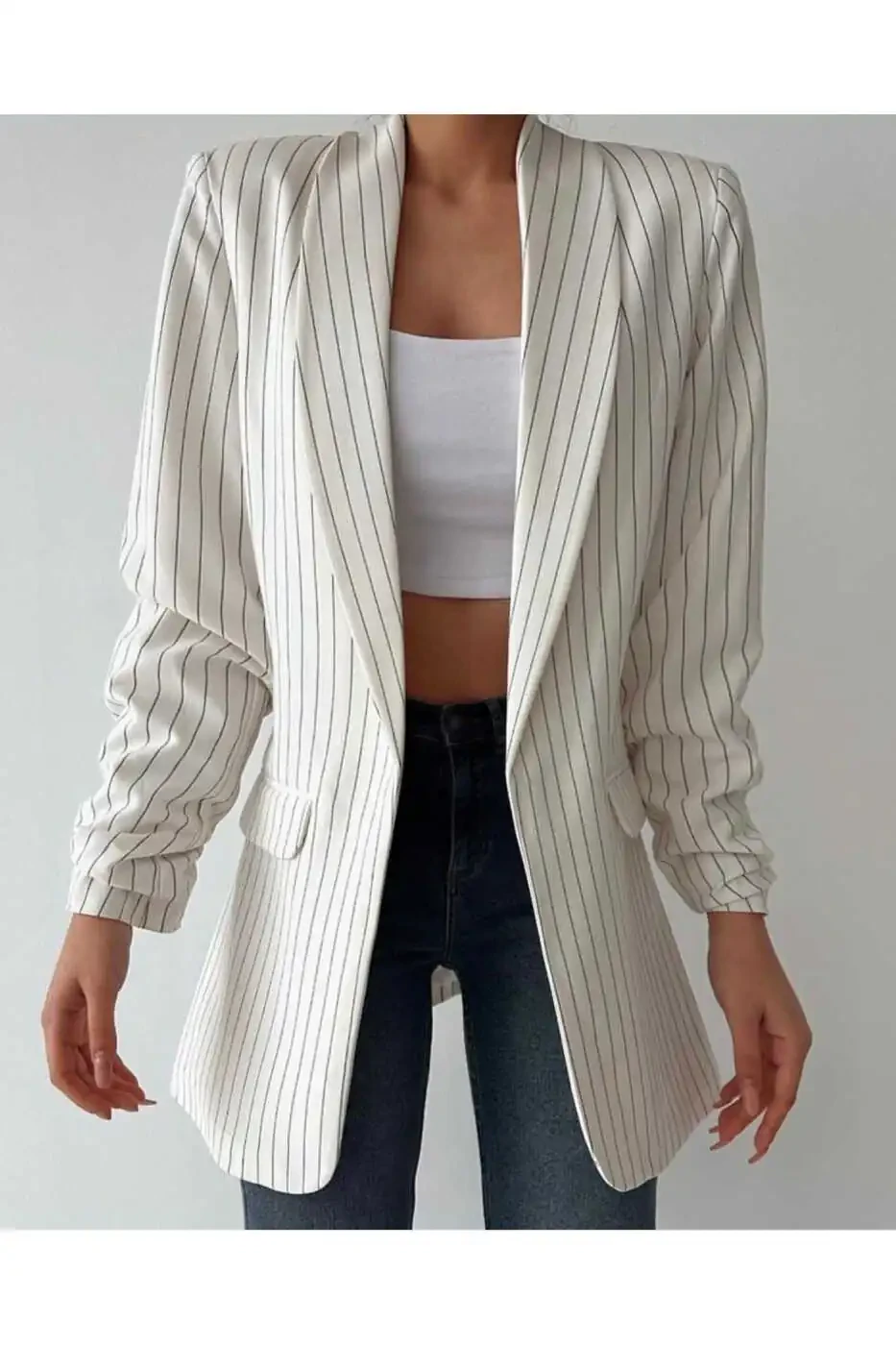 İnce Çizgili Beyaz Rahat Kalıp Blazer Ceket'i, günlük kombinlerinizde kot pantolon, t-shirt veya bluz ile kombinleyebilirsiniz. Özel günlerde ise elbise veya eteklerle şık bir görünüm elde edebilirsiniz.