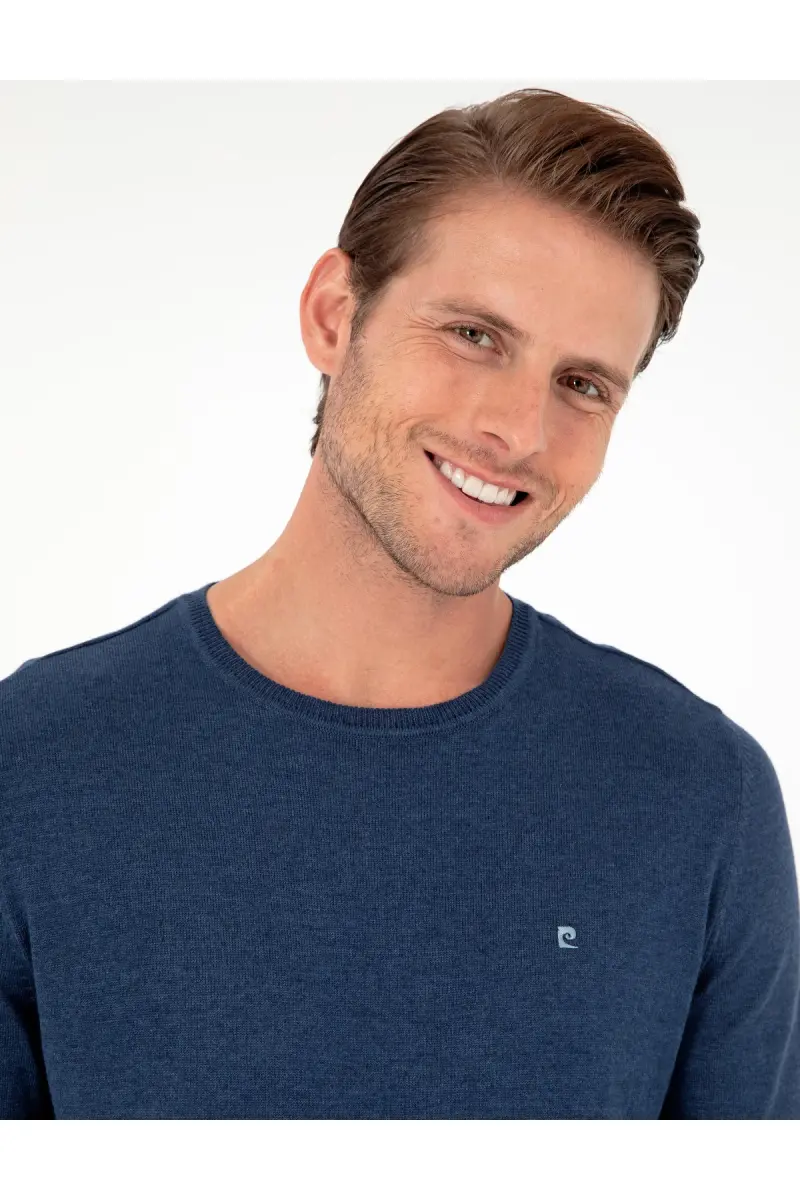 İndigo Melanj Slim Fit Bisiklet Yaka Basic Triko Kazak 50296621-VR155-İndigo Melanj