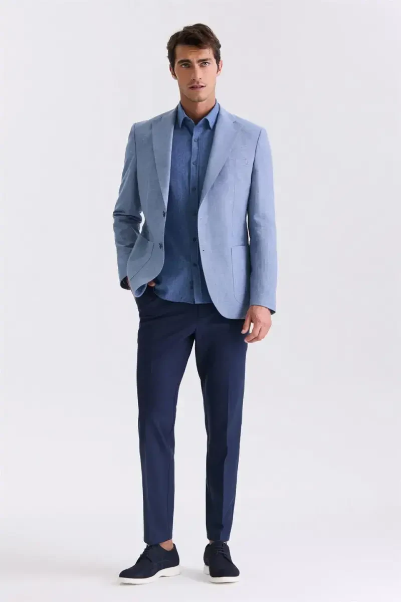 Стильно и комфортно выглядите в летние месяцы в спортивном пиджаке из льна Slim Fit с моно-воротником цвета индиго. Это отличный выбор для любого случая, от повседневного использования до особых событий.