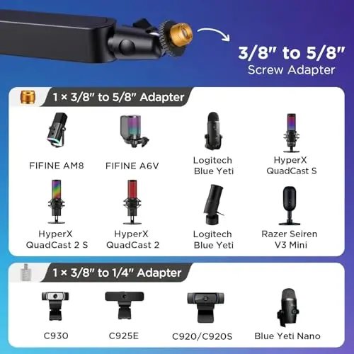 Space-Saving, Ultra-Sleek Design: With the lower arm sitting just 3.35 inches above the desk, this mic arm stand stays discreet while freeing up valuable desk space—perfect for minimalist setups, small workstations, or cluttered streaming desks where every inch counts. Integrated Magnetic Cable Management: The built-in snap-on magnetic cable channel makes setup effortless: just press to lift and snap wires into place. Unlike bulky external hooks that tangle and snag, this sleek design keeps cables completely hidden and tangle-free for a professional, clutter-free look. Full-Range Adjustability: A full 360° base rotation, 180° swivel, 170° tilt, and 360° shaft rotation give you studio-grade flexibility, ensuring your mic stand is always in the ideal position—whether you’re standing, sitting, or switching between setups. Rock-Solid Stability: Engineered from solid alloy steel, the upgraded InnoGear low-profile arm stand combines durability with functionality. With a maximum payload of 1.5 kg (3.3 lbs), it effortlessly supports your microphone setup while ensuring a secure connection. Assembly is quick and hassle-free—simply insert the arm into the table mount and tighten the knob for a stable, reliable setup. Secure C-Style Clamp: Crafted from robust alloy, our C-style clamp ensures unwavering stability for both your mic and desk setup. Designed with ample contact area and rubber padding, it expertly secures to desktops up to 2.36 inches thick (flat edges only), safeguarding against marks or scratches. Enjoy seamless, noise-free adjustments during recording or streaming sessions, courtesy of its impeccably smooth operation and steadfast grip. Universal Compatibility: This mic arm includes two screw adapters for broad device support. The 3/8" to 5/8" adapter fits HyperX SoloCast 2, HyperX QuadCast 2 S, Razer Seiren V3 Mini, HyperX QuadCast 2, Blue Yeti, Blue Snowball, Blue Snowball iCE, Hyper X QuadCast, SoloCast, Shure SM7B, MV7, Fifine AmpliGame, Fifine K669B (Shock mount not included), Fifine AM8 and etc. The 3/8" to 1/4" adapter extends compatibility to devices with 1/4" thread hole like Blue Yeti Nano, Logitech webcam C930, C925E, C920/C920s and so on.