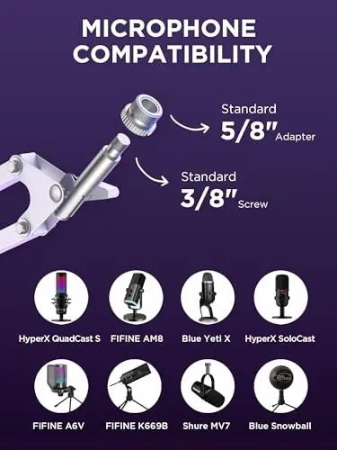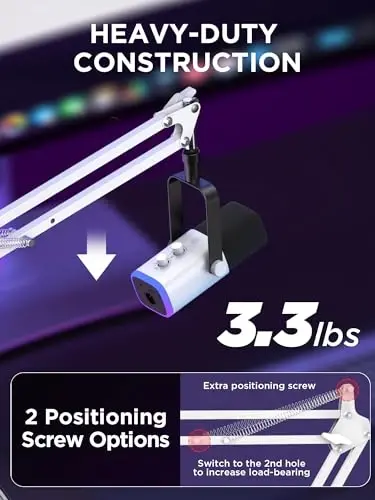 Making studio-quality recordings is now much easier with the InnoGear Boom Arm Microphone Stand! This professional microphone stand is designed to be compatible with Blue Yeti, HyperX QuadCast SoloCast, Snowball, Fifine, Shure SM7B, and many other microphone models. With its medium size and stylish white color, this stand adapts to any environment, maximizing your sound quality by holding your microphone in the ideal position.The InnoGear Boom Arm Microphone Stand stands out with its fully adjustable design. Thanks to its 360° rotatable base, 135° forward-backward adjustable arm, and 180° up-down tiltable shaft, you can easily bring your microphone to the desired position. In addition, the 270° rotatable metal adapter allows you to freely position your microphone. It can be easily folded and put away after use, so you can save space on your desk. It is ready for use in seconds when you need it.Unlike other microphone stands, the InnoGear Boom Arm Microphone Stand has a unique design that extends spring life. This innovative design, which eliminates spring deformation caused by the buttons on the arm shaft, ensures that the stand and springs last longer. Thanks to its high-quality steel material, super strong springs and extra positioning hole, it can carry up to 1.5 kg of weight. This feature allows you to use your microphone safely during live recordings. Silent and effortless microphone positioning is essential for professional recordings.The desk edge mounting bracket securely holds onto flat desk edges up to 5 cm thick. Please make sure your desk edge is flat and not sloped or curved. The product offers compatibility with various microphones. It comes with a standard microphone clip for dynamic microphones such as Shure SM58, Samson Q2U, Shure PGA48. It also includes a 5/8" - 3/8" adapter for microphones such as Blue Yeti, Blue Snowball, Blue Snowball iCE, Hyper X QuadCast, SoloCast, Shure SM7B, MV7, Fifine AmpliGame, Fifine K669B (Shock mount not included), Fifine AM8. The InnoGear Boom Arm Microphone Stand offers you flexibility and compatibility, meeting all your recording needs.