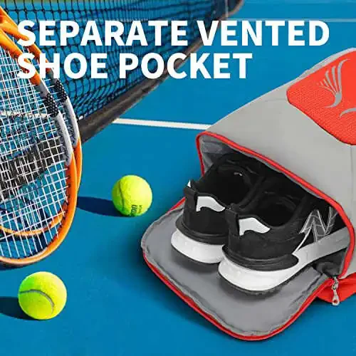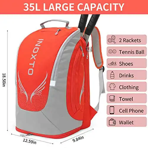 INOXTO 40L Tenis Çantası, hem kadınlar hem de erkekler için mükemmel bir seçenektir. 2 tenis raketi, top, spor ayakkabı ve diğer ekipmanları rahatça taşıyabileceğiniz geniş bir alan sunar. Su geçirmez ve nefes alabilen malzemeden üretilmiştir, böylece eşyalarınızın kuru ve düzenli kalmasını sağlar. Bağımsız ayakkabı depolama alanı, ayakkabılarınıza kolay erişim sağlarken, çantayı temiz ve düzenli tutmanıza yardımcı olur.
