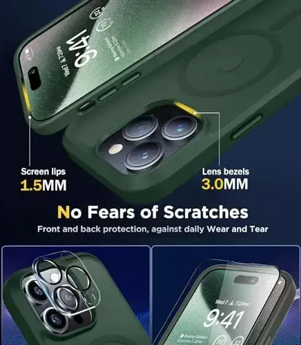 The BossKiss iPhone 15 Pro case offers superior protection and style for your phone. Its Magsafe-compatible design ensures a seamless experience with wireless charging and other Magsafe accessories. Thanks to the reinforced N56 magnets, it provides the strongest magnetic hold on the market, allowing you to use your phone safely. This case can support up to 3.5 lbs/1600g of weight and is fully compatible with Qi-certified Magsafe chargers, wallets, and car mounts. The fast and efficient 30W wireless charging feature reduces power consumption to almost zero.Designed for your phone's safety, this case offers 13FT military-grade protection. It has passed over 5000 tests, distributing 99% of the impact force and saving you from expensive repair bills. The hard and explosion-proof back panel, the flexible TPU bumper with 4-layer cushioning, and the 4 air cushion shock-absorbing compartments effectively absorb severe impacts when your phone is dropped or bumped.The BossKiss iPhone 15 Pro magnetic case comes with 1 screen protector and 1 camera lens protector. These protectors shield your screen and camera lens from scratches, shocks, and impacts. Maintaining original response sensitivity and ultra-clarity, it offers a flawless user experience. Suitable for both women and men, this case is made using a new generation of matte translucent coating and environmentally friendly materials. You will enjoy holding your phone in your hand thanks to its silky touch. Its ultra-thin design preserves the original size of the iPhone 15 Pro while protecting your phone from stains, dust, oil, and sweat. It can be easily cleaned with a damp paper towel.