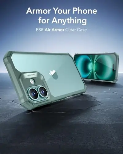 iPhone 16 g‘ilofi, ESR Air-Armor, harbiy sinf himoyasi, shaffof g‘ilof, zarbani yutuvchi, tirnalishga chidamli, sarg‘ayishni oldini oluvchi, ingichka dizayn, yashil g‘ilof, ko‘tarilgan qirralar