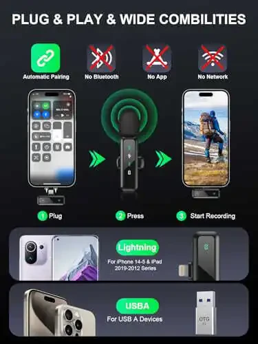 AVTOMATIK JUFTLANISH: Ulag va ishga tushirish. Adapterni shunchaki iPhone yoki iPad-ga ulang, kichik mikrofon quvvat tugmasini uzoq bosing va zavqlaning. Toza ovoz sifati uchun 80 FT gacha uzatish masofasi va 360°omnidirectional qabulni qoʻllab-quvvatlaydi.