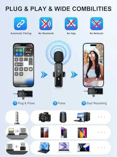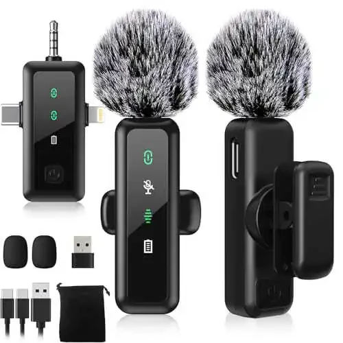 **3'ü 1 Arada Kablosuz Lavalier Mikrofonlar** iPhone/Android/Kamera Cihazları için (Lightning/USBC/3,5 mm Jak), 2'li Paket Mini LED Ekranlı Yaka Mikrofonu TikTok/YouTube/Vlog Kaydı İçin Susturma/Yankı/Gürültü Azaltma ile**Önemli Özellikler:*** **Geniş Uyumluluk:** iPhone, Android telefonlar, iPad, DSLR kameralar ve dizüstü bilgisayarlar dahil olmak üzere çeşitli cihazlara bağlanmak için üç farklı konektör (Lightning, USBC, 3,5 mm jak).* **Net Ses Kaydı:** Yüksek hassasiyetli mikrofonlar, kristal netliğinde ses kaydı sağlar ve arka plan gürültüsünü en aza indirir.* **Çok Yönlü Ses Efektleri:** Sessiz, yankı ve gürültü azaltma özellikleri, farklı kayıt ortamları için optimize edilmiş özelleştirilebilir ses ayarları sunar.* **Gerçek Zamanlı İzleme:** Mini LED ekran, pil seviyesini, kayıt durumunu ve ses efektlerini gerçek zamanlı olarak göstererek kolay kullanım sağlar.* **Uzun Pil Ömrü:** Tek şarjla 10 saate kadar çalışma süresi, uzun süreli kayıt seanslarını destekler.* **Taşınabilir ve Kolay Kullanım:** Kompakt tasarım ve hafif yapı, rahat kullanım ve kolay taşınabilirlik sağlar.* **Çoklu Kullanım:** TikTok, YouTube, vlog kaydı, röportajlar, toplantılar ve diğer ses kayıt uygulamaları için idealdir.**Paket İçeriği:*** 2x 3'ü 1 Arada Kablosuz Lavalier Mikrofonu* 3x Kablo (Lightning, USBC, 3,5 mm jak)* 2x Mikrofon Klipsi* 2x Rüzgarlık* 1x Taşıma Çantası