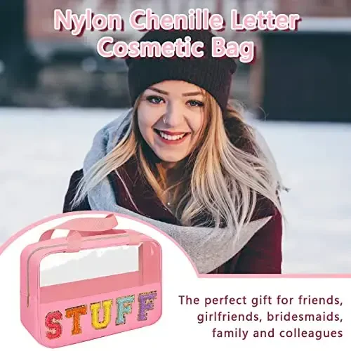 The Iqimott Chenille Letter Patch Stuff Bag is a stylish and practical solution to accompany you on your travels and in your daily life. This preppy-style clear makeup and cosmetic bag stands out with its spacious interior and durable material, while also appealing to current trends with its design. The sparkly chenille letters on the bag (such as STUFF, BABY, TRAVEL, MAMA) offer different options depending on your intended use, allowing you to reflect your personal style. Thanks to the combination of high-quality nylon and PVC material, it is lightweight, durable, and waterproof. It has a large interior to neatly store your makeup, snacks, toiletries, travel essentials, and other daily necessities. Its transparent design allows you to easily see what's inside and quickly find what you're looking for. This versatile bag can be used not only as a makeup bag, but also as a snack bag, travel bag, beach bag, toy bag, etc. It is a suitable option for stadiums, sports events, parties, and other social activities. The Iqimott Chenille Letter Patch Stuff Bag combines practicality and style, making your life easier while complementing your style. It is a perfect gift option for your friends, lovers, bridesmaids, family, and colleagues.