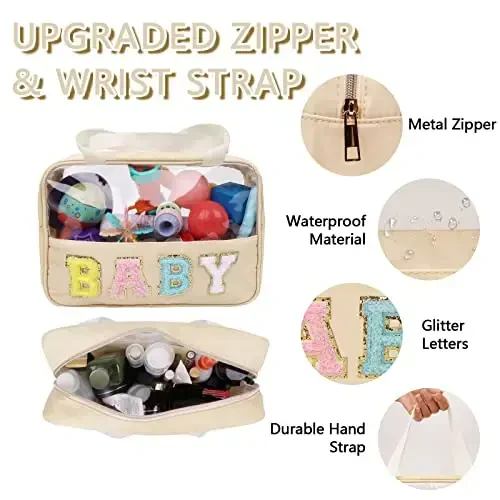 【Fashionable Design】Nylon makeup cosmetic bag incorporates the most popular fashion elements at the moment - Glitter letters and a unique stylish shape design. According to the different letters: STUFF, BABY, TRAVEL, MAMA, you can use it as a different storage bag. 【Chenille Glitter Letters】Preppy letter cosmetic bag is 11.41x 7.87 x 3.54 inches. Made of high quality nylon and PVC material, lightweight and durable . Ideal as a clear makeup bag for travel, gym, bathroom, daily carry-on bag and luggage. 【Waterproof & Large Capacity】Zipper toiletry bag is waterproof, dust-proof surface and easy to clean, just wipe clean and air dry as required. This clear cosmetic bag has enough space to store makeup, snacks, toiletries, travel essentials and other daily necessities. 【Widely Application】Clear makeup cosmetic bag is big enough to carry cell phones, portable chargers, wallets, keys, sunglasses, cosmetics, etc. Suitable for stadiums, arenas, soccer games, any sporting events, parties, etc. 【Perfect Gift】Chenille letter makeup bag can be used as a makeup bag, snack bag, travel bag, beach bag, toys bag, etc. It is also the perfect gift for friends, girlfriends, bridesmaids, family and colleagues.