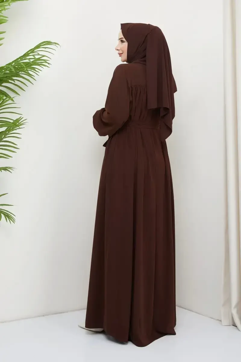 Islomiy tesettur kiyimida nafosat va qulaylikni birlashtirgan ushbu jigarrang robali burmali Madina ipakli faraja, oʻziga xos dizayni va sifatli matosi bilan ajralib turadi. Toʻliq boʻyli kesimi bilan tana chiziqlarini yashirib, tesettur tamoyillariga mos koʻrinishni taqdim etsa, roba detali va burmali dizayni bilan zamonaviy va nafis koʻrinish beradi. Madina ipakining betakror tuzilishi farajaga yumshoq teginish va yengil oqishlik berib, kun boʻyi qulay foydalanish imkonini yaratadi. Jigarrang rangi ham klassik, ham zamonaviy kombinatsiyalar uchun ideal tanlov boʻlib, har qanday muhitga moslasha oladigan abadiy nafosatni taqdim etadi. Ushbu faraja maxsus kunlarda yoki kundalik foydalanishda tanlashingiz mumkin boʻlgan ham nafis, ham qulay tanlovdir. Tesettur kiyimida sifat va nafosatni qidirayotgan ayollar uchun ideal tanlovdir. Matoning nafas oladigan tuzilishi tufayli terlashni oldini oladi, bu esa ayniqsa issiq havoda katta afzallik beradi. Shkafingizning ajralmas qismlaridan biriga aylanadigan ushbu faraja, uzoq yillar davomida nafosatingizni saqlashga yordam beradi. Ham nafis, ham qulay kiyim tajribasini taqdim etadigan ushbu faraja, tesettur modasiga zamonaviy teginish qoʻshadi.