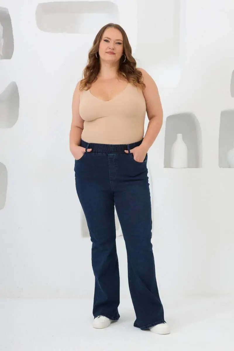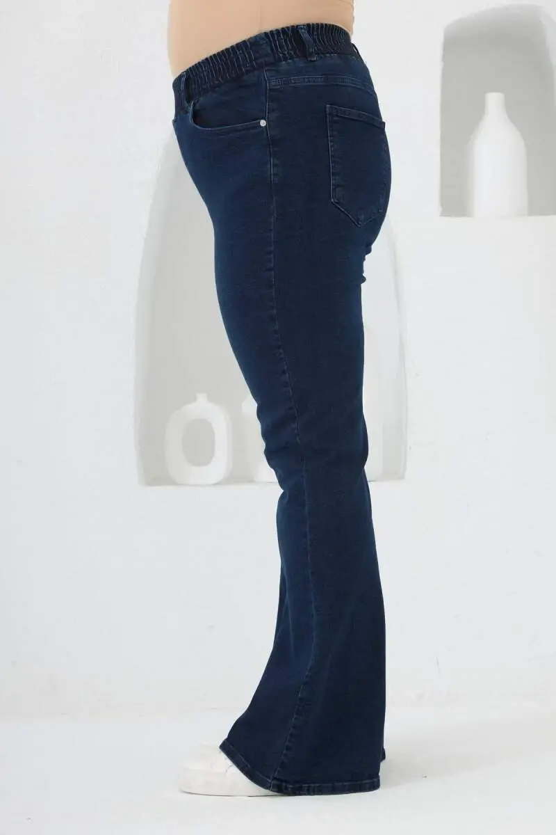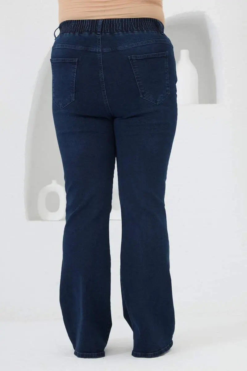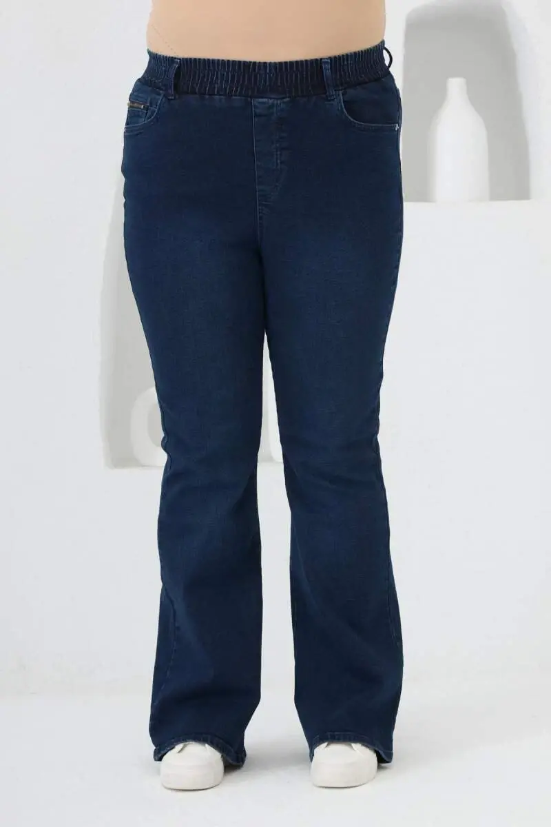İspanyol Paça Beli Lastikli Büyük Beden Kot Pantolon Mavi