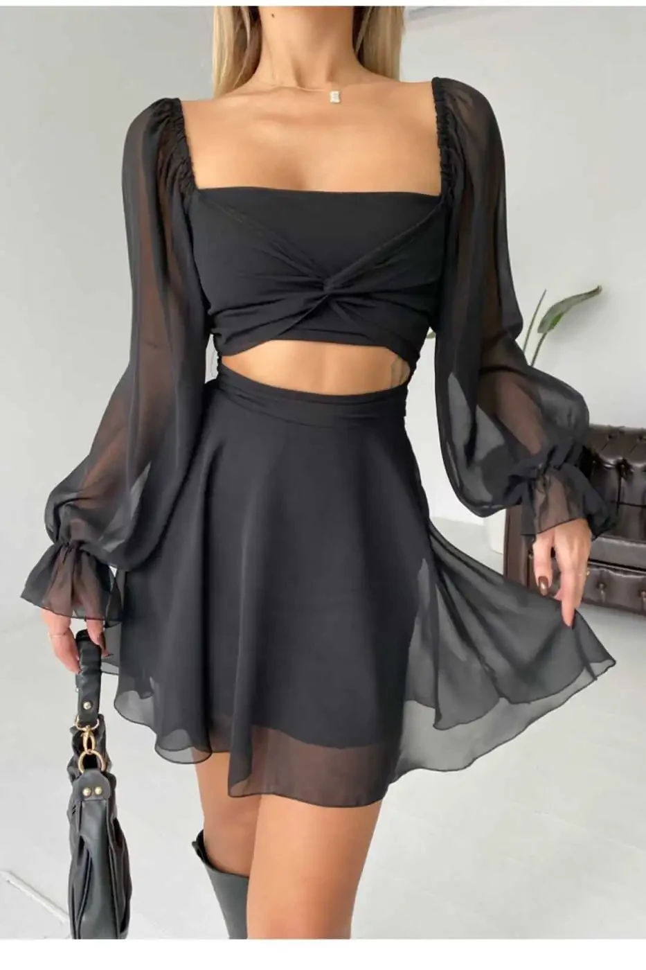 Ослепите всех на своих особых мероприятиях с помощью платья "Черное вечернее платье из шифона на подкладке, имитирующее юбку и топ", которое представляет собой идеальное сочетание элегантности и стиля. Этот уникальный дизайн создает иллюзию того, что он состоит из юбки и топа, предлагая современный и изысканный вид. Легкость и струящийся шифон подчеркивают элегантность каждого вашего движения, а подкладка позволяет вам чувствовать себя комфортно и уверенно в течение всего дня. Это вечернее платье в черном цвете идеально подходит для любых вечеринок, коктейлей или специальных мероприятий. Юбка платья имеет элегантный крой, заканчивающийся на уровне колен или чуть ниже. Верхняя часть привлекает внимание прозрачностью шифона, а подкладка идеально подчеркивает ваши формы. Это вечернее платье легко сочетается с различными аксессуарами и предлагает идеальную основу для отражения вашего стиля. Независимо от того, дополните ли вы его стильным ожерельем и туфлями на каблуках или предпочтете более сдержанный вид с минималистичными украшениями, вы никогда не пожертвуете своим стилем. Это вечернее платье выделяется не только своим внешним видом, но и качественным исполнением. Он был тщательно сшит и подшит с учетом деликатности шифона. Таким образом, он сохранит свою элегантность, как и в первый день, на долгие годы и станет одним из незаменимых предметов вашего гардероба. С платьем "Черное вечернее платье из шифона на подкладке, имитирующее юбку и топ" вы приобретете не просто платье, а вневременную элегантность. Обязательно попробуйте это уникальное вечернее платье, чтобы сделать ваши особые моменты незабываемыми и привлечь всеобщее внимание в любой обстановке. Самый лучший способ почувствовать себя особенной и дать заговорить своей элегантности – это возможно с этим уникальным дизайном! Помните, что стиль – это позиция, и это платье дает вам возможность наилучшим образом отразить эту позицию.