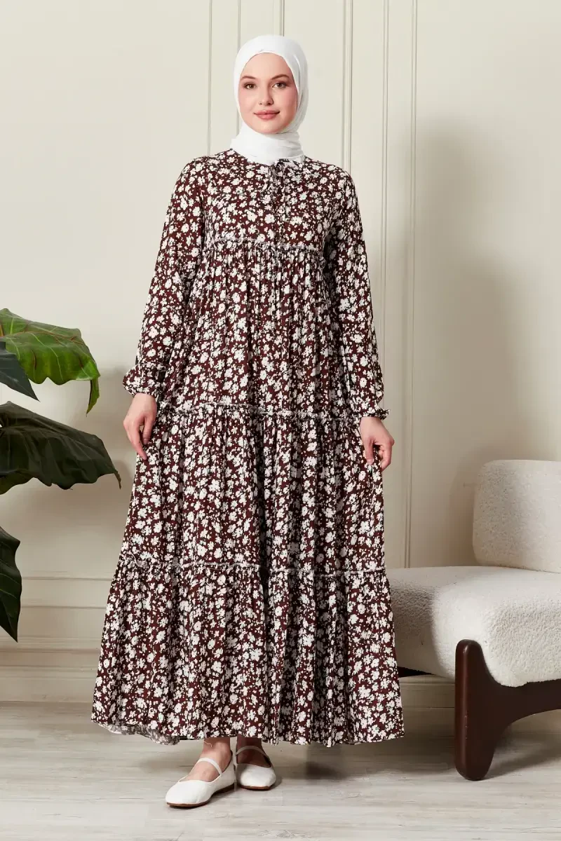 Eteği kat kat çiçek desenleriyle bezenmiş, göz kamaştırıcı bir şıklık sunan bu tesettür elbise, hem günlük kullanımınızda hem de özel anlarınızda size eşlik edecek. "Eteği Kat Kat Çiçek Desenli Çingene Viskon Elbise" adıyla sunduğumuz bu özel tasarım, modern ve zarif detayları bir araya getirerek gardırobunuzun vazgeçilmezi olmaya aday. Bisiklet yakası, elbiseye çağdaş bir hava katarken, rahat kesimi sayesinde gün boyu konforlu bir kullanım sunar. Viskon ribana dokuması, cildinize yumuşak bir dokunuş sağlarken, nefes alabilen yapısıyla terlemeyi önler ve gün boyu ferah kalmanıza yardımcı olur.Elbisenin en dikkat çekici özelliği olan kat kat çiçek desenleri, bohem ve romantik bir stilin yansımasıdır. Her katında farklı bir zarafet barındıran bu desenler, hareketli ve canlı bir görünüm yaratır. Bağcıklı kemer detayı ise belinizi nazikçe vurgulayarak feminen bir siluet oluşturmanıza olanak tanır. İster kemerini bağlayarak daha fit bir görünüm elde edin, isterseniz kemersiz kullanarak daha salaş bir tarz yakalayın.Uzun kollu tasarımı, serin havalarda sizi sıcak tutarken, uzun boy kesimiyle de tesettür giyimin gerekliliklerini yerine getirir. İç göstermeyen yapısıyla gün boyu rahat ve güvende hissedersiniz. Fırfırlı detaylar, elbiseye hareket ve dinamizm katarken, her adımınızda özgün bir tarz sergilemenizi sağlar.Bu elbiseyi sadece günlük kullanım için değil, aynı zamanda anne elbisesi veya namaz elbisesi olarak da tercih edebilirsiniz. Rahatlığı ve şıklığı bir arada sunan bu tasarım, her ortamda size eşlik edecektir. İlk yıkamada hafif çekme yapabilme ihtimaline karşın, ütülenerek eski haline getirilebilir. 30 derecede yıkama önerisiyle de kolayca temizleyebilirsiniz."Eteği Kat Kat Çiçek Desenli Çingene Viskon Elbise", her mevsim giyebileceğiniz çok yönlü bir parçadır. Yaz aylarında sandaletlerle kombinleyerek bohem bir hava yakalayabilir, kış aylarında ise botlarla ve kalın bir hırka ile tamamlayarak sıcak ve şık bir görünüm elde edebilirsiniz. Cepsiz tasarımıyla minimalist bir stil sunarken, üzerinizde ağırlık yapmaz ve hareket özgürlüğünüzü kısıtlamaz.Kahverengi çiçek deseni, doğal ve sıcak bir görünüm yaratırken, farklı renklerle kolayca kombinlenebilir. Bu elbiseyi, hem kendi tarzınızı yansıtmak hem de tesettür giyimin zarafetini yaşamak için tercih edebilirsiniz. Gardırobunuzun en sevilen parçası olmaya aday bu özel tasarım, size her zaman iyi hissettirecek.