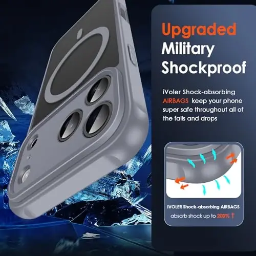 ivoler Magnetic Case for iPhone 17 Pro Max 6.9'' Features: - Magsafe compatible - 15 FT military grade protection - Magnetic charging support - Frosted translucent back for iPhone 17 Pro Max - Impact resistant bumper design - Color: Gray