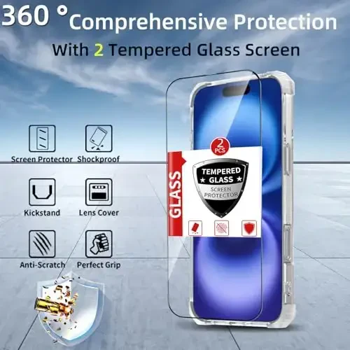 【Compatibility】This protective phone case is only compatible with iPhone 16. Precise cutouts ensure easy access to all buttons, speakers, and charging port without adding bulk. Supports wireless charging.【Military Grade Protection】The iPhone 16 case is made of hard PC back and soft silicone bumper around the edge. It has passed the Military Standard drop test. The dual-layer design and shockproof corners provide strong protection for your phone from drops, bumps, and scratches.【Built-in Kickstand】The iPhone 16 case with stand has a built-in metal kickstand that can be rotated 360 degrees, is easy to flip and fold, and is firm enough to keep your phone safe. The stand case provides you with multiple adjustable stand angles, which is very convenient for watching videos, learning, and working.【Sliding Camera Lens Protection】The iPhone 16 case with camera cover adopts a sliding camera cover design, which can easily slide and lock to protect your camera from scratches and abrasions. When you need to take pictures, you can easily slide it open and ensure that it will not slide on its own.【Screen Protector】This iPhone 16 case comes with 2 high-quality screen protectors, which are scratch-resistant, high-definition, and highly sensitive. They can provide maximum protection for your phone screen without affecting the display quality and touch screen sensitivity.