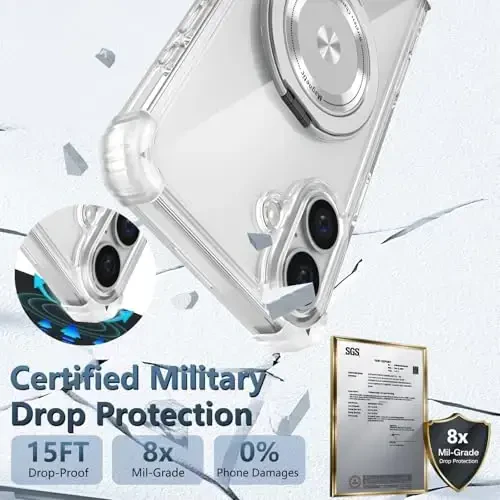 iPhone 16 g'ilofi, harbiy darajadagi himoya, o'rnatilgan stend, kamera himoyasi, ekran himoyasi, simsiz zaryadlash, zarbani yutuvchi, tirnalishga chidamli, 360 daraja stend, ingichka dizayn, tushish testi