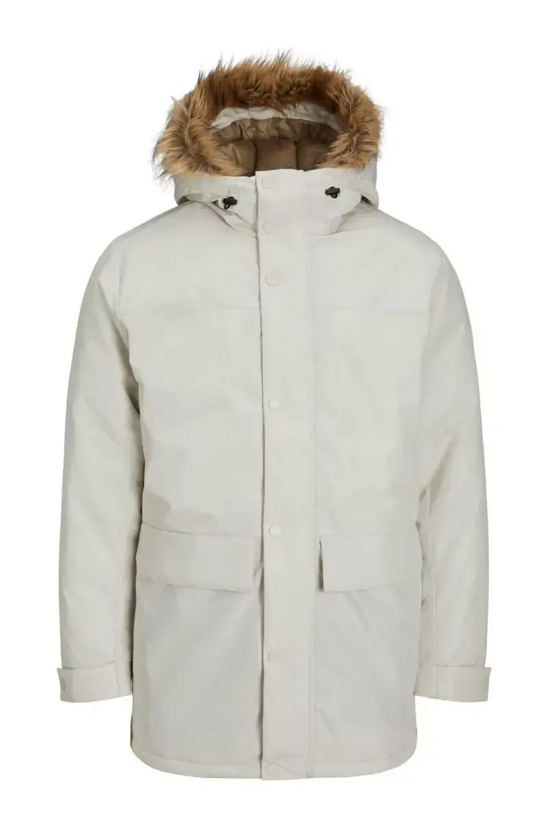 Jack & Jones Bej Kapüşonlu Erkek Mont | Suni Kürklü, Şık ve Sıcak Tutan Kışlık Mont