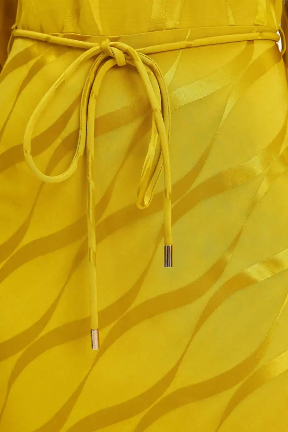 jakard ko'ylak, o'z-o'zidan naqshlangan ko'ylak, bel bog'lamali ko'ylak, yorilgan ko'ylak, midi uzunlikdagi ko'ylak, sariq ko'ylak
