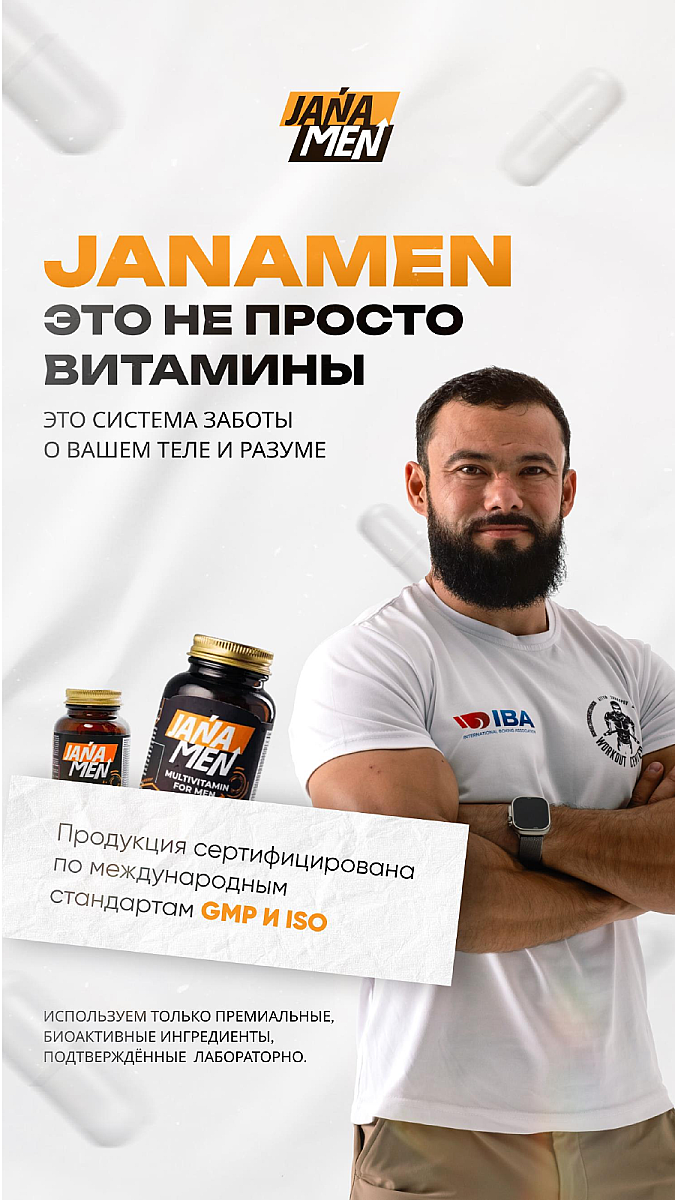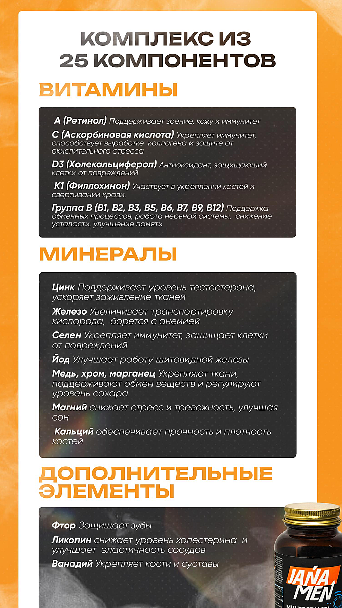 Jana Men for Men — это мультивитаминно-минеральный комплекс, предназначенный для мужчин. Формула включает компоненты, которые помогают поддерживать ежедневный уровень энергии, общее состояние организма, иммунитет и активный образ жизни. Продукт содержит 25 активных компонентов и разработан для удобного ежедневного приема. Также указано, что продукт произведен в соответствии с международными стандартами и подтвержден сертификатами.