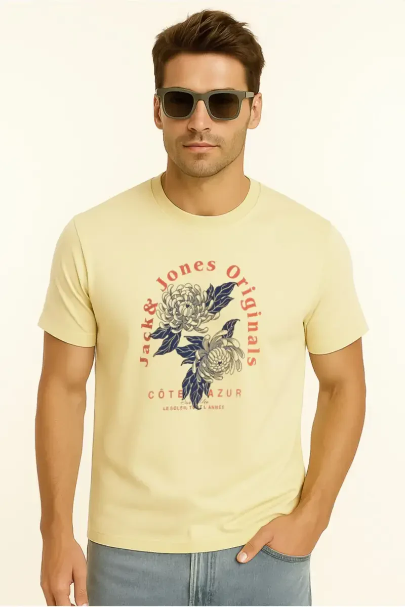 Men's t-shirt, logo printed t-shirt, yellow t-shirt, J&J t-shirt, cotton t-shirt, men's clothing, comfortable t-shirt, casual t-shirt, modern t-shirt, stylish t-shirt