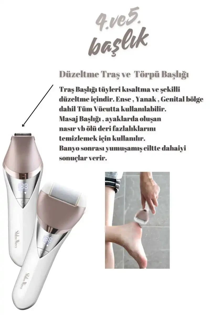 - 6 Boshcha: Tanangizning har qanday qismiga moslashish uchun mo'ljallangan turli boshchalar (yuz, bikini zonasi, oyoqlar, qo'ltiq osti, sezgir joylar).