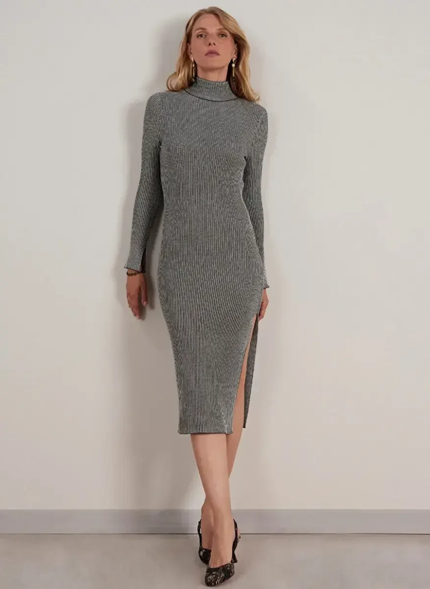 Yargıcı High Neck Striped Anthracite Knee Length Women's Dress 23KKEL7741X offers long-term use with its high-quality material and stylish design. It can be easily combined thanks to its anthracite color and striped pattern. It is ideal for daily use and you can reflect your style with different accessories. It is recommended to follow the washing instructions on the product label.