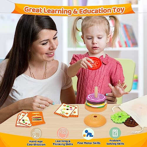 Great Value Montessori Toys - Our wooden stacking burger toys contain 15 activity cards, a wooden base and 8 wooden ingredient pieces: lettuce, beef, onion, cheese, tomatoes, bread and egg. Lots of cards and treats, enough for kids to make burgers of all flavors, and the bright colors and realistic shapes will definitely catch the attention of kids and keep them hooked. Funny Educational and Learning Toys - The order cards are double-sided, with illustrations of finished hamburgers and picture instructions on how to make hamburgers, you can play the role of customers, choose cards and let children make hamburgers according to the instructions on the menu, which will greatly improve kid's concentration, fine motor skills, hand-eye coordination, creativity and imagination. Safe and Durable Stacking Toys - Our burger stacking toy is made of high-quality wood with a polished surface, which is not only smooth but also very durable, and all food ingredients pieces are made of odorless and non-toxic water-based paint, which guarantees the safety of kids in many aspects, and you can rest assured to hand it over children. Stacking Toys with Storage Bag - Our burger stacking toys come in vivid shapes and colors to help kids learn about food in their lives, it’s definitely a great addition to the kitchen game. And the package is also equipped with a storage bag, which can help you store and take out toys easily, keep your room tidy and avoid losing toys at the same time. The super portable storage bag is also convenient to take the toy anywhere (school/party/travel). Ideal Gift For Kids 3, 4, 5 Years Old - Fun, educational and safe, this Montessori toy is great for kids boys girls entertainment. And the toy also comes with a beautiful gift box, which is definitely the perfect gift for kids boys girls birthdays and holidays (Children's Day, Christmas, Halloween, Valentine's Day and New Year).