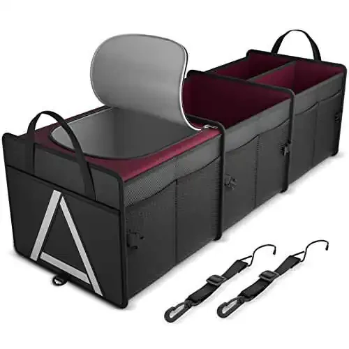 The K KNODEL Sturdy Car Trunk Organizer is a heavy-duty collapsible trunk storage organizer with premium insulated cooler bag, providing excellent organization and order in your car, SUV, truck, or van. With its 3 compartments, it keeps your belongings organized and easily accessible, making your journeys more comfortable.