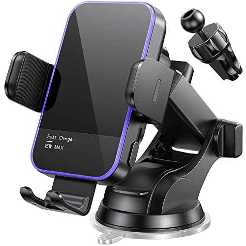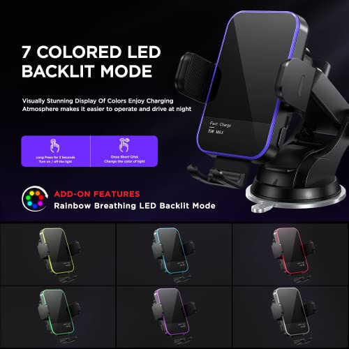 15W QI FAST WIRELESS CAR CHARGER: Wireless car charger mount charges your Qi-enabled smartphone on the go and optimizes the power output delivery. It offers 15W Max Charging Speed for LG V50/V40/V30+, 10W Charging Speed for Samsung Galaxy S24 Ultra / S23 / S22 / S21+ / S20 / Note 10+, 7.5W Charging Speed for iPhone 16/15/14/13/12 Pro Max/11 / XS Max/XS, 5W for Other Qi-Enabled Phones. ***For 15W 10W, 7.5W FAST CHARGING MODE, QC 3.0 CAR CHARGER ADAPTER (not in the package) is Necessary as its power source. Includes 1 USB-C charging cable, and only 1 port provides power and can only charge one device at a time COLORFUL LIGHTING MODES: Includes 7 monochrome lights modes, and 1 rainbow breathing RGB backlit mode. The light makes driving more fun, glows to amplify the atmosphere and also makes it easier to operate and drive at night SECURELY SUCTION POWER Up to 50LB: We greatly improved the suction power and the material of car phone holder mount wireless charging based on the market's feedback. Whether it's extreme weather, sharp turns or steep hills, the car mount always holds up and stays in place. Suction Cup can be reused and restored by simply rinsing under warm water and air drying. ***For optimal performance, allow the suction cup to secure itself to your dashboard for 30 minutes before placing your phone on the holder. This step ensures a strong, lasting bond SMART AUTO CLAMPING FUNCTION with METAL DESIGN: All you have to do is gently place your phone into the mount, then it automatically closes snugly around the device and adjust to the most suitable position for charging! Releasing the phone is as easy as touching a button. Made of aluminium alloy, the frame of the phone mount for car wireless charger is more sturdy and elegant TWO ACCESSORIES, MULTIPLE MOUNTING OPTIONS: Comes with suction cup and vent clips, the phone mount for car has several installation methods to stick on the windshield, dashboard, vent or the most flat surfaces. Ideal accessories for most cars, vehicles, pickup, trucks, SUVs and taxis. It is also a travel essentials / gift for Uber, Lyft and kharly drivers. ***Avoid excessively steep surfaces to ensure proper sticking. the clips are not compatible with round vents or vents that have a dense vertical structure STACKABLE DESIGN: The car phone holder supports charging through phone cases up to 4mm thick. Please note that cases made of metal, external attacModazoneents such as credit cards, grips, uneven surface and stands will interfere with charging FLEXIBLE ANGLE ADJUSTMENT: 360° ball joint and extendable telescopic arm allow to custom the phone to any angle. This phone holders for your car let you use the phone in portrait and landscape mode, which enjoys a safer and more relaxed driving experience.