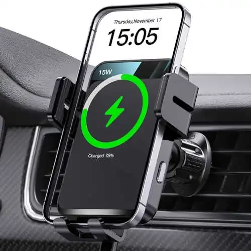MOKPR Otomatik Klipsli Araç Montajı, iPhone 15/14/13/13 Pro/12 Pro Max/12 pro/12/11/10 Serisi, Samsung Galaxy Serisi ve diğer Qi özellikli akıllı telefonlar dahil olmak üzere çeşitli cihazlarla uyumlu 15W/10W/7.5W hızlı şarj özelliği sunan bir kablosuz araç şarj cihazıdır. Telefonunuzu güvenli bir şekilde sabitlemek için otomatik klips teknolojisini kullanır ve 360 derece döndürülebilir başlık, en uygun görüş açısını sağlar. Havalandırma menfezine takılan bu şarj cihazı, aracınızın hava akışını engellemeden telefonunuzu güvenli ve erişilebilir bir şekilde tutar.