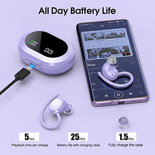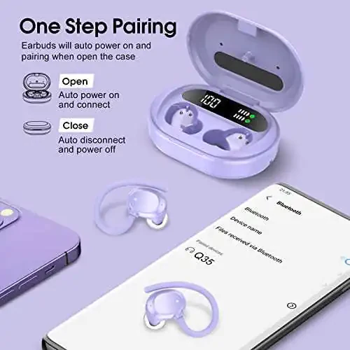 [Designed for Sports]: Flexible, secure-fitting silicone ear hooks and an ergonomic design ensure the earbuds stay comfortable and secure during hiking, running and other outdoor activities. Three different sizes of silicone eartips are included, designed to fit perfectly without squeezing your ear canal and to be worn for long periods of time without fatigue or pain, giving you comfort from the inside out. IPX7 rated waterproof to withstand common splashes and rain. [Ultra-lightweight Sports Bluetooth Earbuds]: Q35 wireless earphones weighs only 6 grams, and the whole product (plus the charging case) weighs only 50 grams. Compared with other sports headphones with ear hooks to be more lightweight, easy to carry around. [Dual LED Digital Display and Fast Charging]: Q35 wireless earbuds show the remaining charge level of the charging case by the number on the charging case screen, and the charging status of each earbud by the LED light bar. The charging case has a built-in 400mAh battery, and two fully charged headphones can get up to 5 hours of music playback time. The charging case can charge the dual sport earbuds 5 times for a total of 30 hours of music playback, and supports Type-C fast charging. [High-fidelity Audio and Clear Calls]: The wireless bluetooth headphones features a 10mm speaker and a volume-optimized active equalizer that maintains audio clarity and balance. With a highly supple diaphragm that reproduces a rich bass range while enhancing sound quality and reducing distortion, you'll hear clear HD stereo sound and powerful bass. A hands-free earphones with noise-canceling microphone makes calls easier and clearer to hear. [Gift Selection]: Our Q35 earbuds are especially suitable as a gift for men and women of different ages who love sports, exercise, and fitness. And of course birthdays, anniversaries, Mother's Day, Father's Day, Halloween, weddings, boys, girls and more. Our bluetooth earbuds is a better choice for your gift. Package Contents: 2*Earbuds, 1*Charging case, 1*Mini USB Type-C cable, 1*User manual.