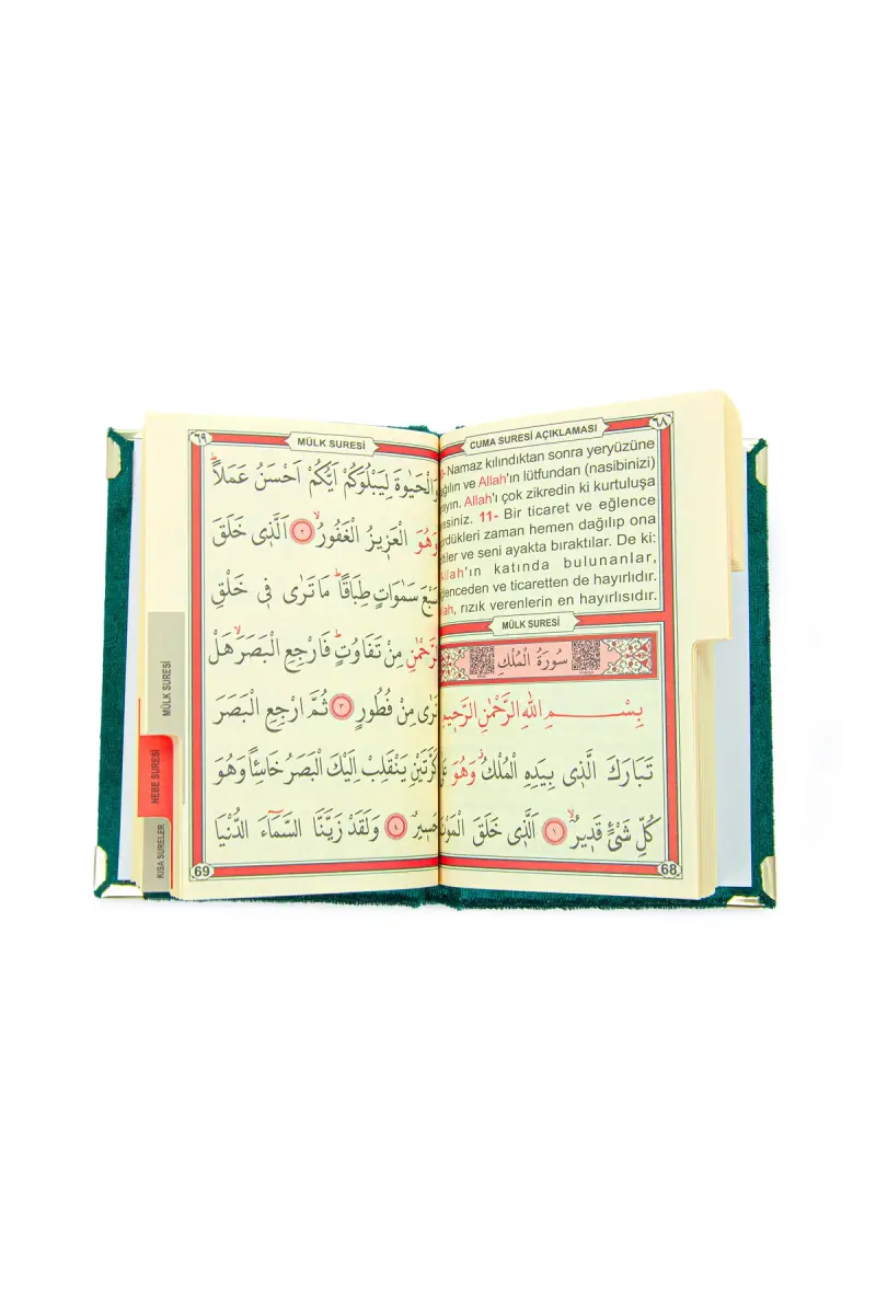 Baxmal bilan qoplangan Yosin xususiyatlari: 12x16 sm. O'lchamdagi baxmal bilan qoplangan 128 betli Yosin. Hashamatli, baxmal mato bilan maxsus qoplangan. Baxmal bilan qoplangan Yosinlarimizning barchasida sahifalarning shikastlanishini va qoplangan baxmal matoning qimirlamay turishini ta'minlaydigan himoya burchak temirlari mavjud. Kompyuter shrifti bo'lib, oson o'qiladigan katta shrift bilan yozilgan. Arabcha matn, lotincha (turkcha) talaffuzi, ma'nosi (turkcha ma'nosi), ro'yxat, 128 bet, sumka o'lchami (12 x 16 sm), shomua qog'oz. Yosin-i Sharif kitobi tarkibi (talaffuzi va ma'nolari bilan): Fotiha surasi, Alif Lam Mim, Yosin surasi, Voqia surasi, Juma surasi, Mulk (Tabaraka) surasi, Naba (Amma) surasi, Ayat-el Kursi, Amanarrasulu, Shahidallahu, Inshiroh surasi, Asr surasi, Humaza surasi, Fil surasi, Quraysh surasi, Maun surasi, Kavsar surasi, Kofirun surasi, Nasr surasi, Tabbat surasi, Ixlos surasi, Falaq surasi, Yosin duosi, Salot-i Tafrijiya, Salot-i Munjiya (Tunjina). Sajda xususiyatlari: Og'irligi: 280 gramm. O'lchami: 116 x 69 sm. Chaqaloq mavlidi vafot mavlidi Umra-Haj kabi jamiyatlarda tarqatish uchun mos, engil va yupqa tuzilishi tufayli tashish va ishlatish oson. Iqtisodiy sinfga mansub mahsulotimizdir. Yorqin iplardan yasalgan. Arqog'i va o'rimi turli ranglarda bo'lgan bir turdagi mato turidir. Mahsulotning sifati va narxi tarkibida ishlatilgan ipning sifati va ishlatilgan ip grammajiga qarab o'zgaradi. Tafta nima?: Arqog'i va o'rimi turli ranglarda bo'lgan, shu sababli ichidagi harakat qilar ekan yonar do'nar ta'siri beradigan, ipakli qattiq mato.